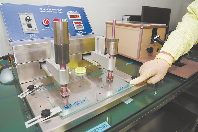 三德信实验室工作人员对光学薄膜进行耐磨性测试