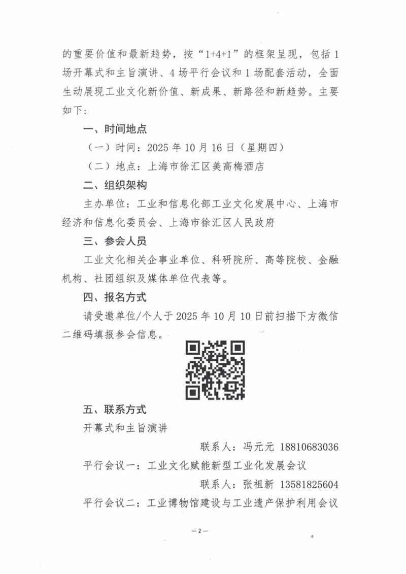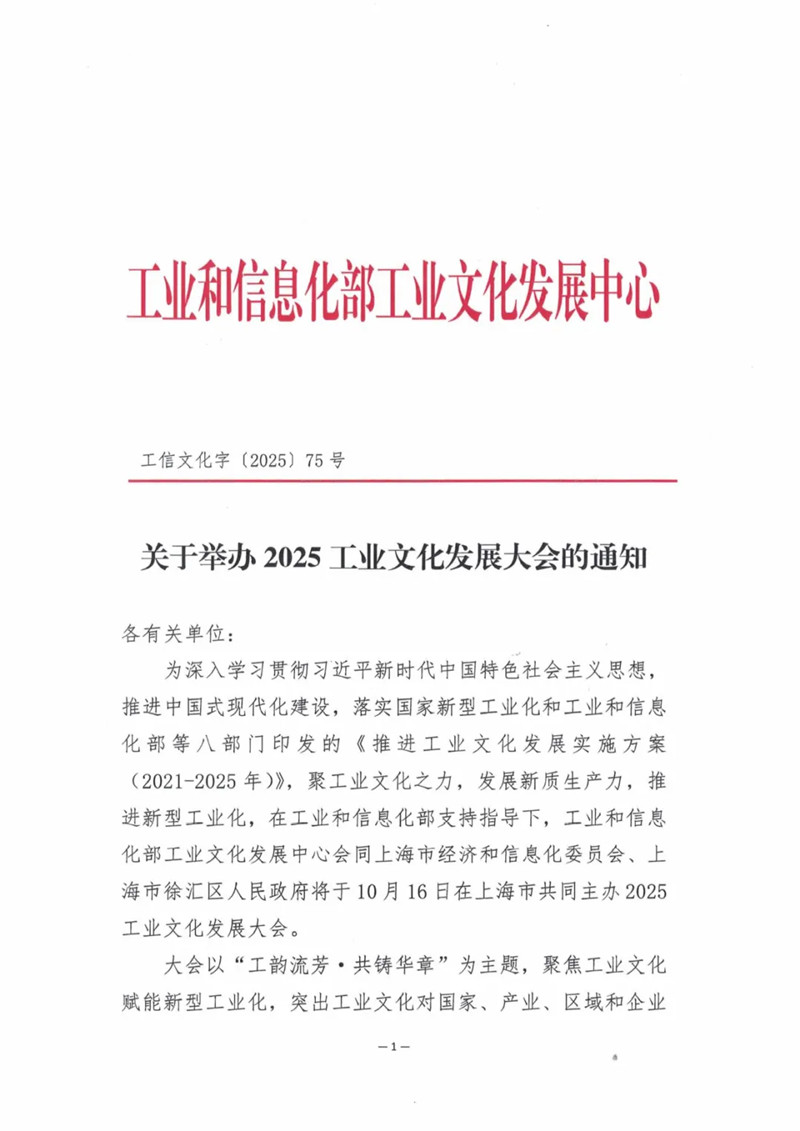 为深入学习贯彻习近平新时代中国特色社会主义思想,推进中国式现代化建设,落实国家新型工业化和工业和信息化部等八部门印发的《推进工业文化发展实施方案(2021-2025年)》,聚工业文化之力,发展新质生产力,推进新型工业化,在工业和信息化部支持指导下,工业和信息化部工业文化发展中心会同上海市经济和信息化委员会、上海市徐汇区人民政府将于10月16日在上海市共同主办2025工业文化发展大会。