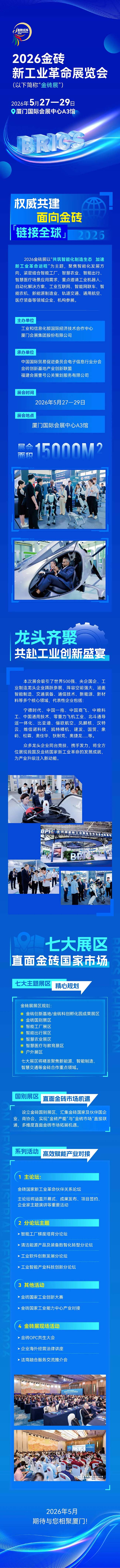 2026金砖新工业革命展览会(以下简称“金砖展”)将于2026年5月27—29日在厦门国际会展中心举办。