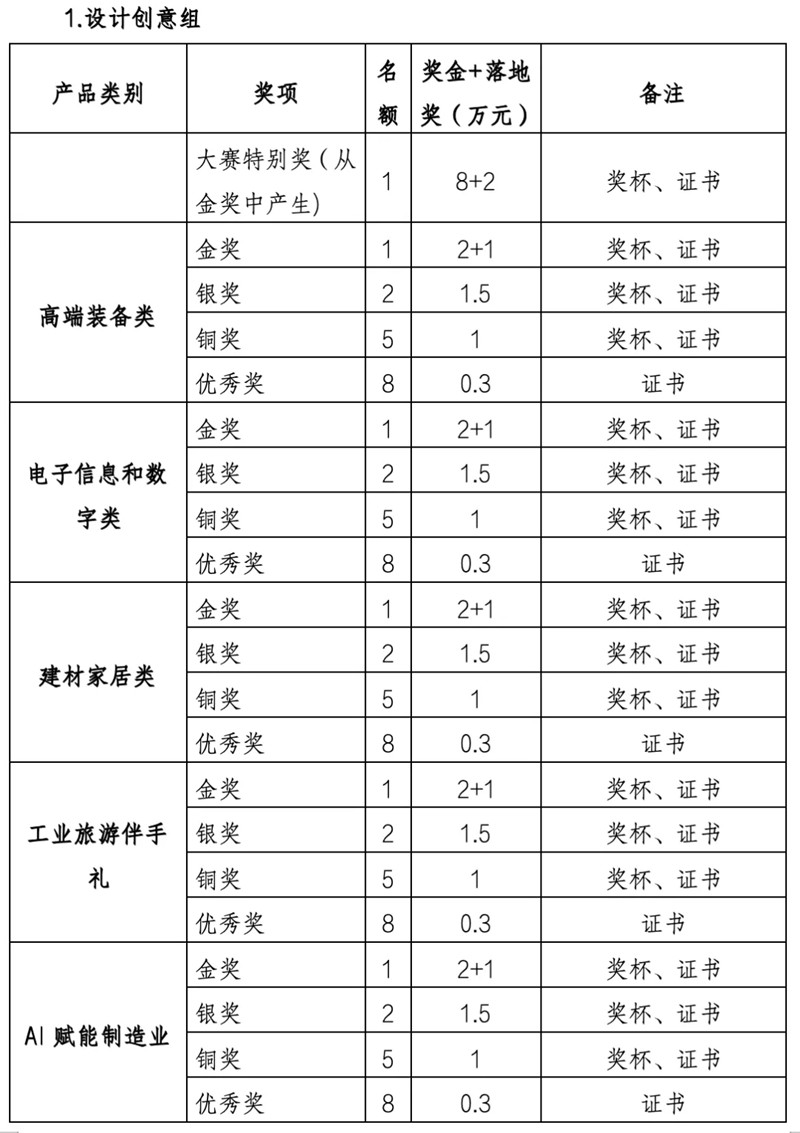 1.综合赛:分为设计创意组和产品创新组两大组别。设计创意组以面向院校为主,所报作品及方案要以引导市场消费升级为导向,能引导或迎合消费新需求的前瞻性创意概念。产品创新组以面向企业为主,产品须为近两年(即2023年8月1日起至2025年8月31日止)已上市销售或已量产的产品。